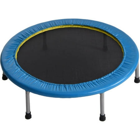 Both of these trampolines are 36″ in diameter. They are durable, have a protective black safety pad, yellow border and detachable legs. Weight should not exceed 250 lbs.