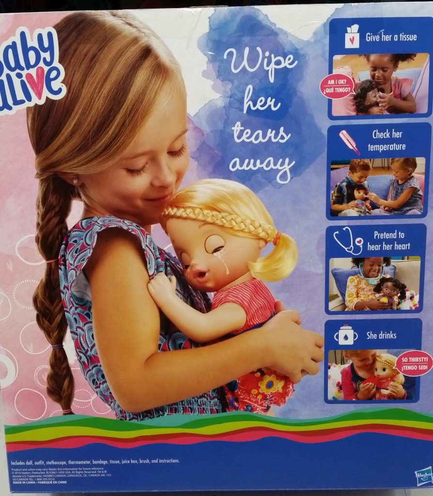 Baby Alive – Sweet Tears Baby was originally marked $48.82 in stores,  it is now marked down to $32.24 (online price).  This doll comes with an outfit, stethoscope, thermometer, bandage, tissue, and a juice box.  Fill the juice box with water to feed her.  She can cry, show emotions and interact with the accessories!  WOW!