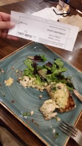 It was completely FREE! Although we paid for John’s meal, it was NOT Bogo or half off. Mine was FREE FREE FREE! Of course we tipped properly!
