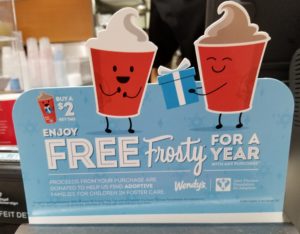 While you’re there, be sure to support the “Dave Thomas Foundation for Adoption” by purchasing a $2.00 key tag.  On every visit, through December 31st, 2018, you’ll receive one FREE Jr Frosty per transaction!  🙂