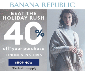 Now through November 20th, you can save 40% off your purchase at Banana Republic. A few restrictions apply. This deal is available in stores and online.