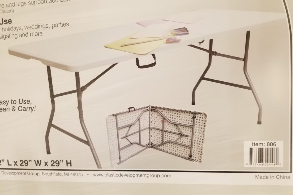 These are perfect at rummage sales too. It is rectangle and measures 72″ L x 29″ W x 29″ H and weighs 30 pounds. It also folds in half for easy storage!