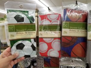 Grab a shower curtain or liner for just $1.00 each. Choose from solids, prints or sports themed! These are also available online by the case!