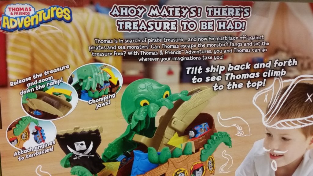 This set includes a sea monster, a pirate ship, treasure chest, and die-cast Thomas engine.  NO batteries needed!
