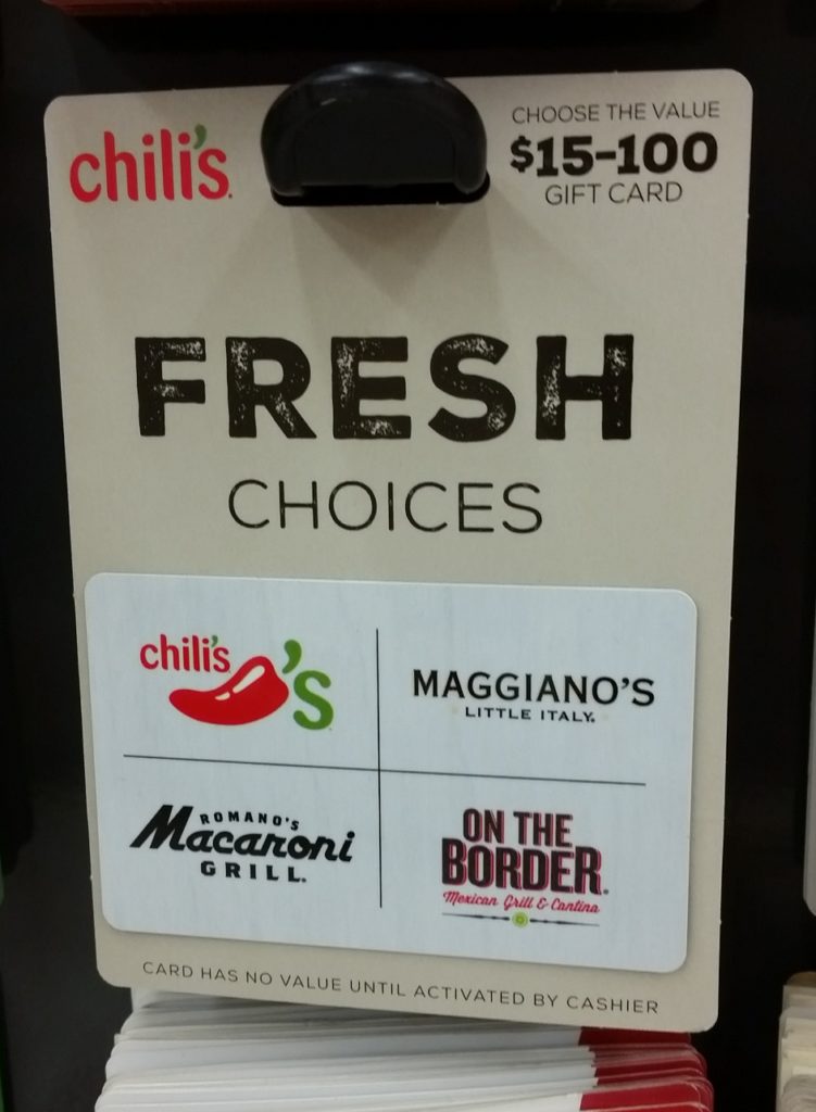 Brinker gift cards include: Chili’s, Maggiano’s, Romano’s Macaroni Grill, and On the border!
