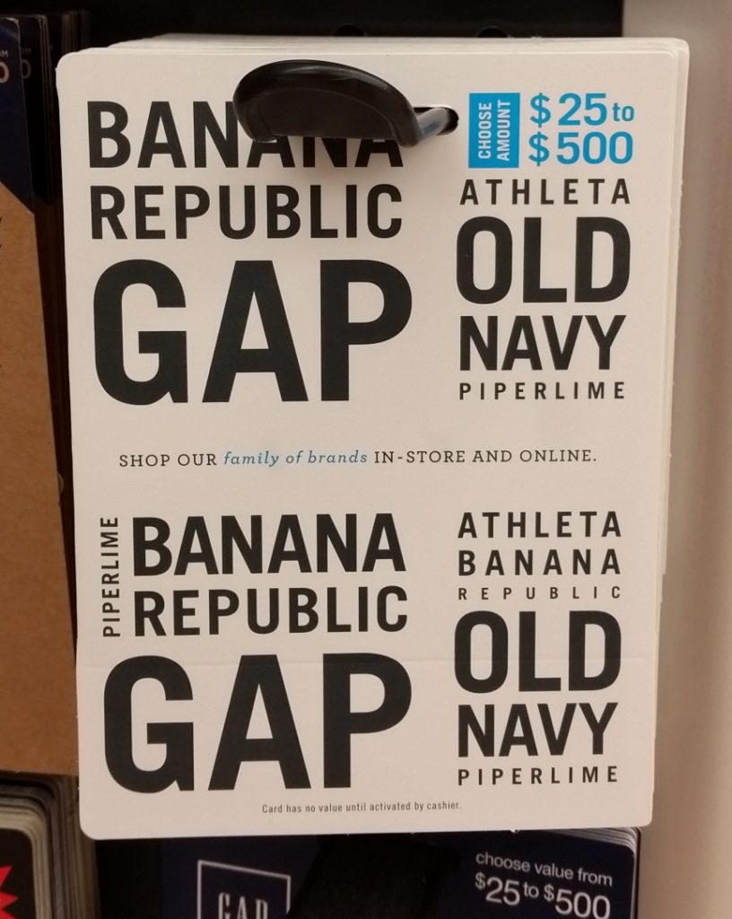GAP Inc gift cards include: GAP, Banana Republic, and Old Navy.