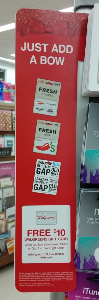 This week at Walgreens, check out their gift card deal! You’ll receive a FREE $10.00 Walgreens gift card after the purchase of “any” 2 $25.00 GAP Inc or Brinker gift cards combinations.