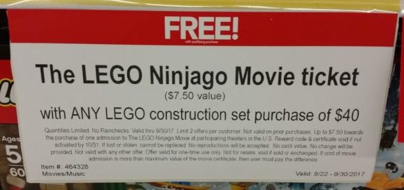 Hurry over to ToysRUs where they are offering a free Ninjago Movie ticket valued up to $7.50.  This is free with any LEGO construction set of $40 or more.  Limit of 2 offers per customer and must be activated by October 31,2017.  THIS OFFER EXPIRES TOMORROW SEPTEMBER 30,2017!!!
