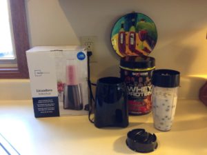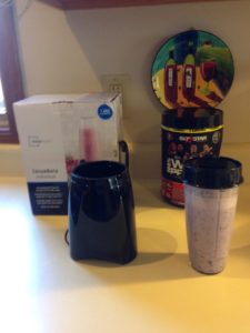 Each blender comes with a 15 oz jar and a travel lid. The cup and lid are dishwasher safe and BPA FREE. It’s easy to operate too! My sister just purchased this blender (shown in black) at her local Walmart! Those are before and after pictures of her protein rich smoothie! YUM!!!