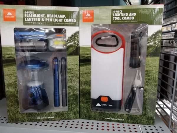 Ozark Trail 4 piece Lighting and Tool Combo $5.00, originally $9.82.  This set comes with a flashlight, camping lantern, 12-in-1 multi-function tool, 1 carabiner and 6 AAA batteries.