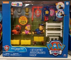 Paw Patrol Pull Back Pup Gift Set (Chase, Skye and Zuma) only $9.98, originally $24.99. Pull Back Pup Gift Set (Marshall, Rubble and Rocky) also $9.98, originally $24.99. Both sets come with pull backs, obstacle coarse accessories and trophies.