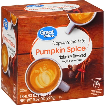 Head on over to Walmart.com to get this Great Value Pumpkin Spice Cappuccino Mix Single Serve Cups, 18 Count for $5.94.  That makes each k-cup only 33¢.  I love it when I find these seasonal deals out of season!