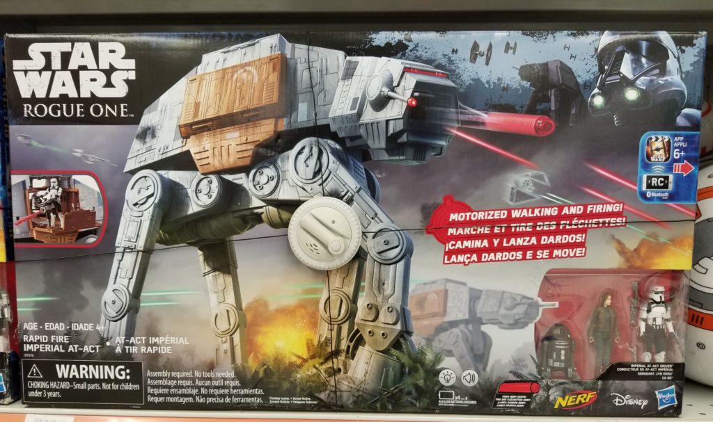 This Star Wars Rogue One Rapid Fire Imperial AT-ACT is on clearance in stores for only $149.98, originally $299.99! This remote control unit walks and fires NERF missiles. It includes: 1 vehicle, 3 figures, an accessory and instructions.