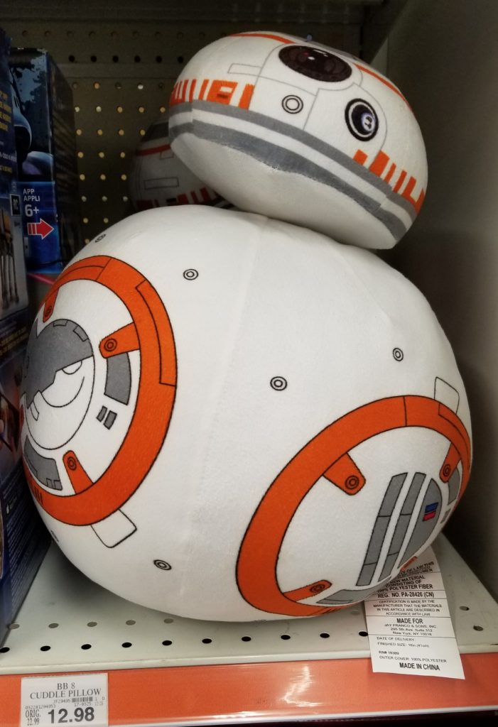This BB-8 Stuffed Cuddle Pillow is on clearance in stores for only $12.98, originally $22.99. There are other BB-8 pillows available online, and they are also marked down.