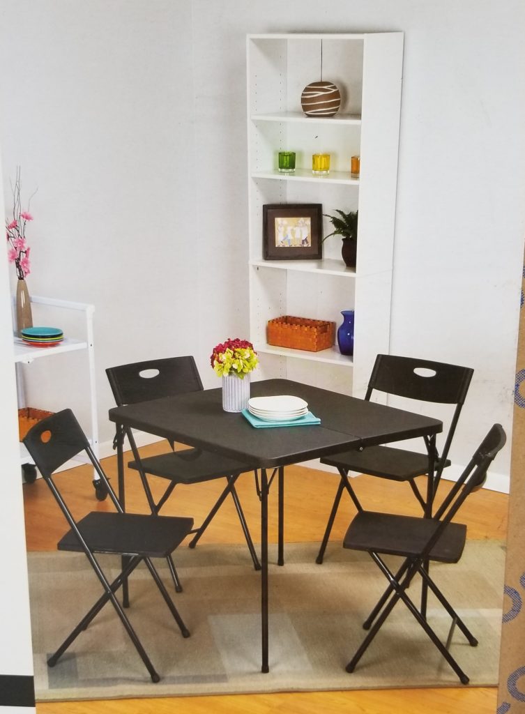 Online, I found this Cosco 5 pc Card Table Set on Rollback for only $87.99, originally $149.99! This set also comes with a table and 4 folding chairs. The chairs are padded and also have the cut out for easy handling!